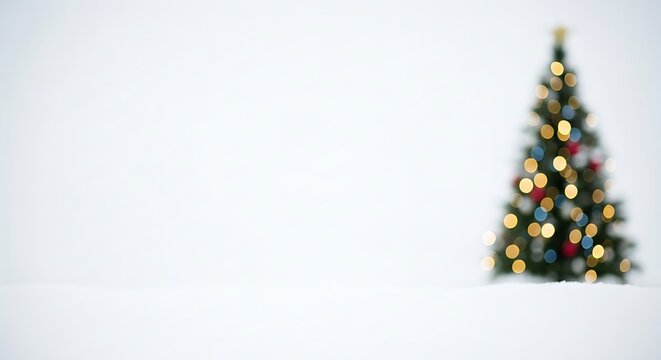 A blurred image of a decorated Christmas tree with lights in the snow, evoking a sense of winter festivity and holiday cheer with a serene background perfect for seasonal greetings and designs
