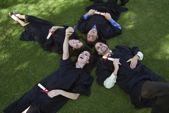 College Graduates Lying on Ground Taking Pictures With Camera Phone
