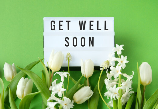 Lightbox with text Get Well Soon surrounded by white tulips and hyacinths on a green background, perfect for recovery wishes or greeting cards