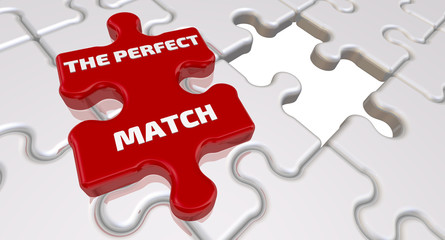 The perfect match. The inscription on the missing element of the puzzle. Folded white puzzles elements and one red with word THE PERFECT MATCH. 3D Illustration