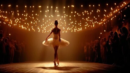 Warm lights illuminate a ballerina in a tutu as she performs on stage in a theater.