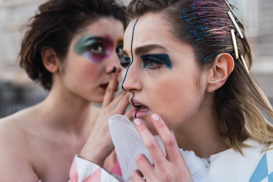 A group of drag performers backstage, vibrant costumes, dramatic lighting, behind-the-scenes energy