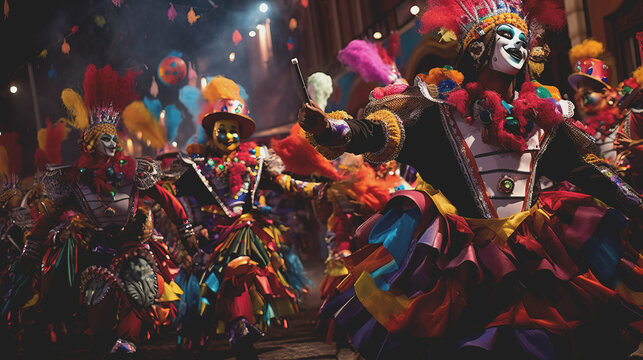 A vibrant carnival parade scene unfolds with performers in dazzling costumes and masks.