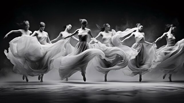 Group of dancer in colored clothes dancing on the stage in long exposure