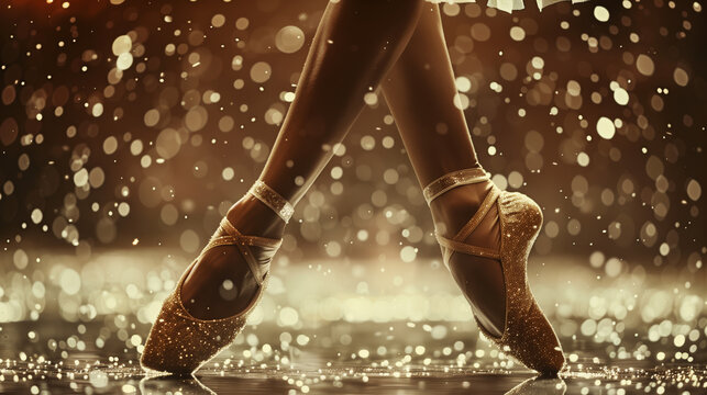 Elegant ballet dancer's feet on pointe shoes, sparkling on a stage bathed in warm golden light.