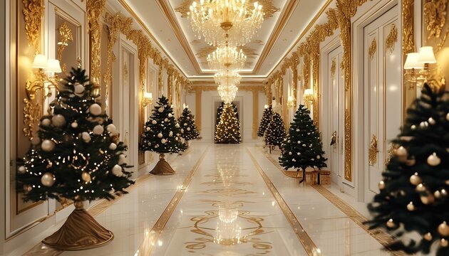 Elegant christmas celebration grand hallway interior design luxurious setting wide angle holiday spirit