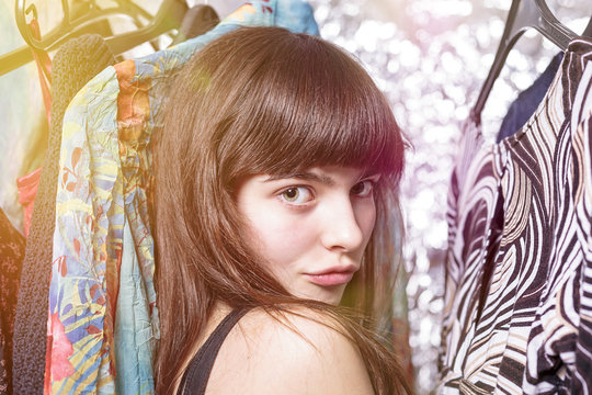 perky teenage girl and her wardrobe, toned image, bokeh, light l