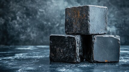 The image captures three meticulously arranged black cubes resting on a textured dark surface, symbolizing strength and permanence in a minimalist yet impactful composition.