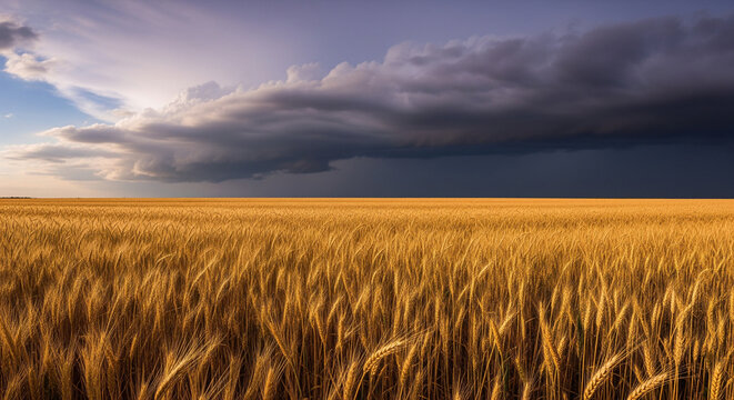 Golden wheat field under dramatic stormy skies brings a sense of calm and resilience, perfect for conveying hope and perseverance in agricultural and environmental contexts