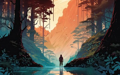 A man stand at the sunset in the mountains.