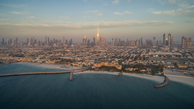 Aerial panoramic view of Burj Khalifa Tower and others skyscrapers of Dubai, UAE.