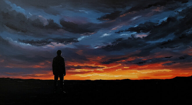 Man standing on top of a mountain and looking at the sunset. A silhouette of a person standing on a mountaintop, gazing towards a vibrant sunrise.