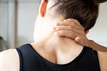 A woman experiencing neck pain, holding and pressing her neck with a strained expression, showing discomfort and tension