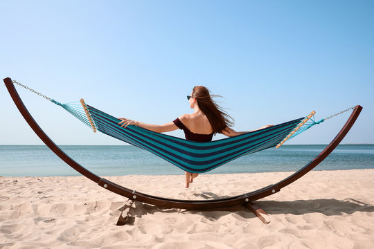 Relaxing woman enjoying leisure in hammock on sunny beach
