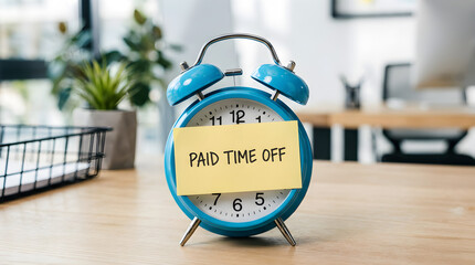 A blue alarm clock with a yellow sticky note reading "PAID TIME OFF" sits on a wooden table in a modern office