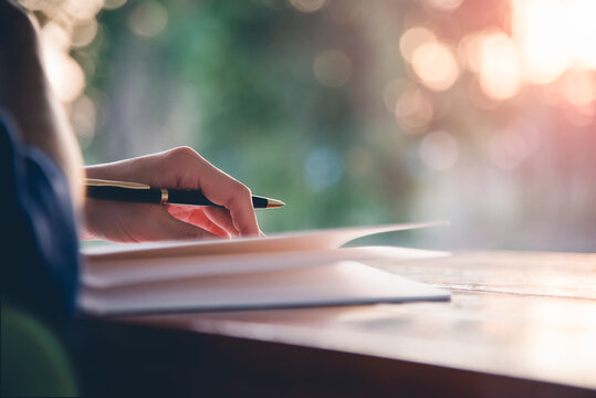 Senior pretty Caucasian female sitting on bed against window writing down her thoughts and ideas in her personal diary, looking at camera with smiling face, feeling relaxed spending time on her own