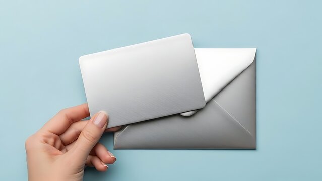 Hand holding blank card with silver envelope on blue background