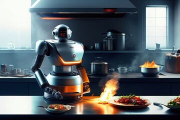 Robot chef cooking in kitchen of future home genius, smart robot working in modern house