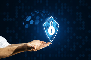Data security concept, padlock on laptop, strong password and firewall protection, safeguarding personal information from cyber attacks