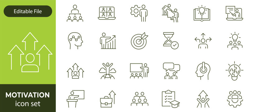 Motivation line editable icon set. Containing personal growth, goal setting, perseverance, achievement, teamwork, passion, thumbs up, and more. Vector illustration