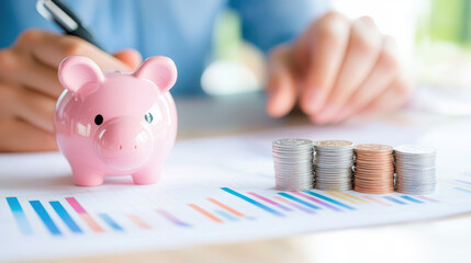 Pink piggy bank sits beside stacks of coins on financial report, symbolizing savings and investment strategies