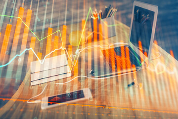 Stock market graph on background with desk and personal computer. Multi exposure. Concept of financial analysis.