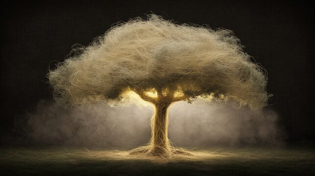 Symbolic tree of life transformation: classic diagram unraveled and rewoven into complex luminous network, soft volumetric light signifies growth