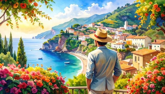 Man enjoying coastal village view symbolizing Mediterranean lifestyle, summer escape, cultural travel and personal reflection on a scenic holiday