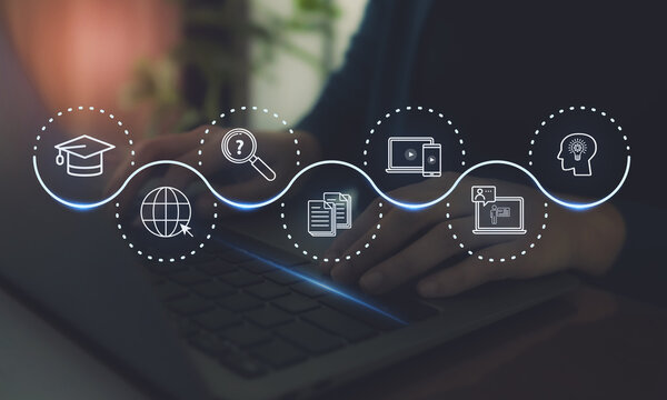 A person managing online identity verification on a laptop, surrounded by digital security elements
