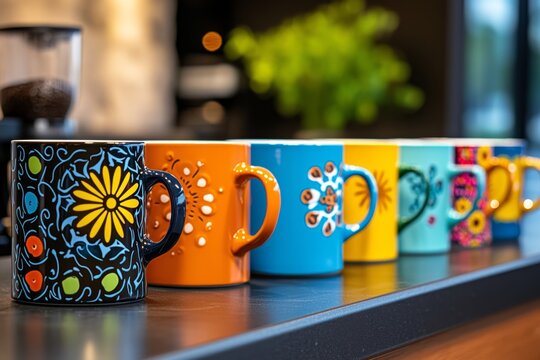 A row of colorful coffee mugs lined up on a shelf, each mug a different size and design, symbolizing personal coffee preferences and morning routines