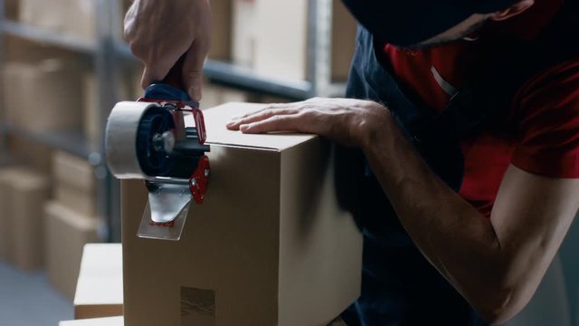Warehouse Worker Checks and Seals Cardboard Box Ready for Order Shipment.