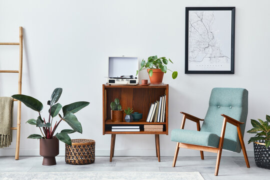 Modern retro composition of living room interior with design wooden cabinet, stylish armchair, mock up poster map, plants, vinyl recorder, books and personal accessories in home decor. Template.