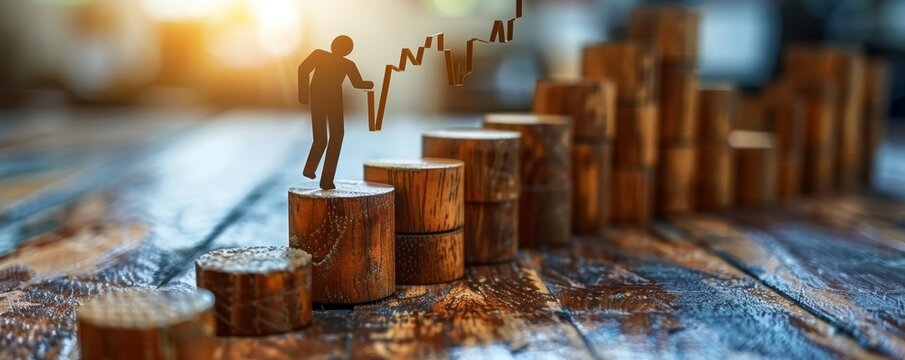 Wooden Blocks Arranged to Show an Upward Trend with a Figure Climbing, Symbolizing Growth, Success, and Progress in Business and Personal Development