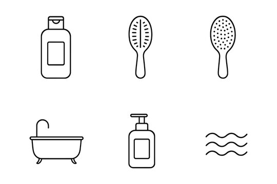 Hair care and bath essentials line icons for beauty, wellness, and personal hygiene branding. Ideal for shampoos, conditioners, bath products, and grooming accessories. Vector illustration