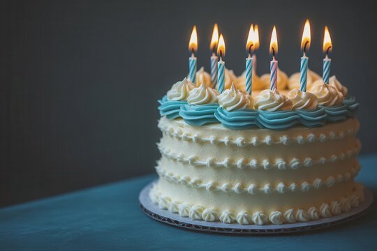 pastel blue background with simple elegant birthday cake six glowing candles cast warm light plenty of copy space for personalization clean minimalist celebration concept