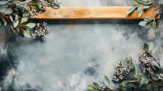 Rustic wooden shelf with greenery and textured background ideal for showcasing decorations and creative designs in a cozy setting