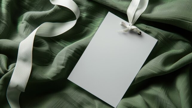 A blank white tag with a ribbon on a soft green fabric background. The tag is empty, suitable for labeling or gift purposes.