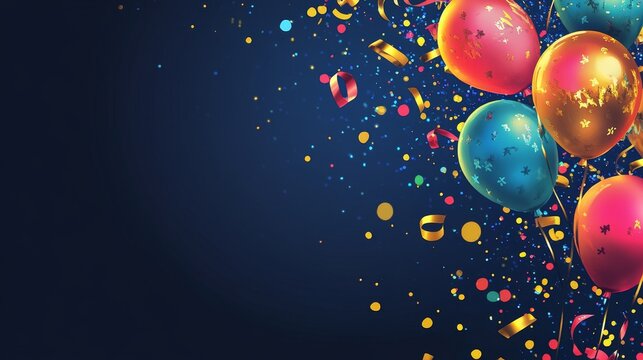 A festive flat lay style background featuring vibrant balloons presents and confetti Perfect for birthday or party greetings with room for a personalized message Copy space image