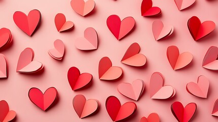Cute red paper cut hearts scattered across a pastel pink table, ideal for designing personalized Valentine’s Day or Mother’s Day greeting cards