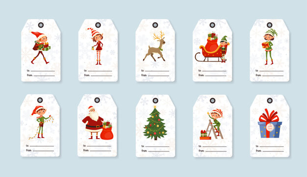 Vector set of Christmas gift tags Santa with sleigh full of gifts, reindeer and cheerful elves, presents Cute winter holiday characters. Collection for holiday packaging, greeting cards, festive decor