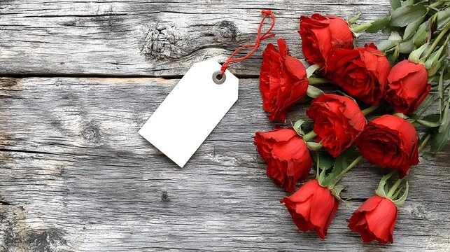 Vibrant red roses are scattered on weathered wooden surface with blank white gift tag for personalized message or romantic surprise present now.