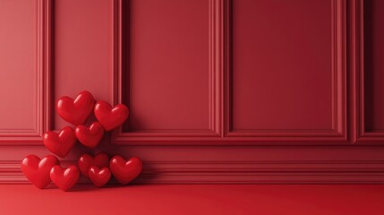Valentine's Day backdrop with decorative red heart cluster against a vibrant red wall, offering space for personalized text and romantic visuals.