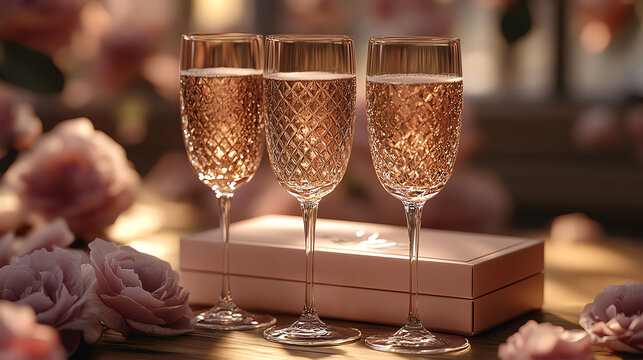 Engraved champagne flutes in personalized gift box, wedding celebration, 3D illustration