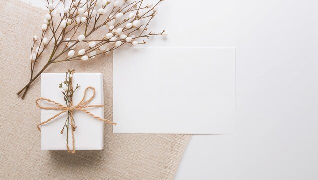 Blank greeting card mockup featuring a present and fresh twigs, ideal for personalized messages