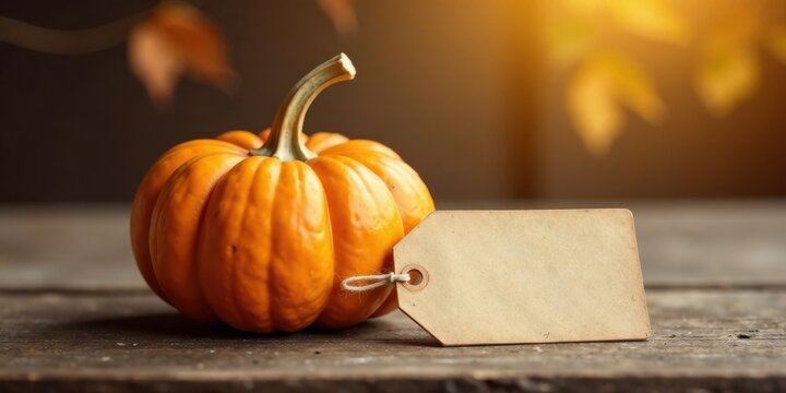 A small autumn pumpkin rests on a rustic wooden surface next to a blank tag, ready for a personalized message or label.