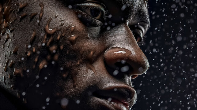 Close-up of Sweaty Face: A close-up shot captures glistening beads of perspiration on the face of a person, highlighting the beauty of human resilience, determination, and exertion.
