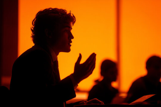 Law student presents mock case in classroom during evening session with vibrant orange background
