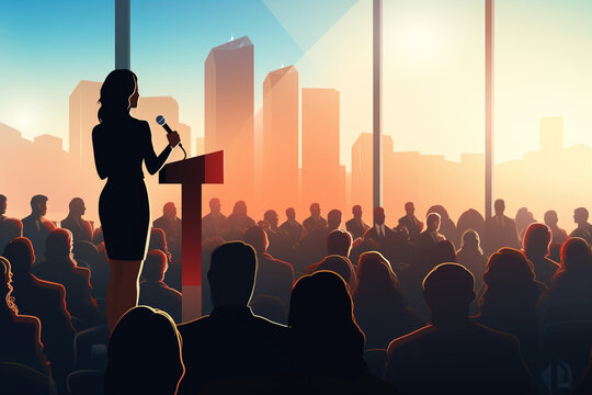 A confident businesswoman giving a dynamic presentation on a stage with a large audience in the background, Business