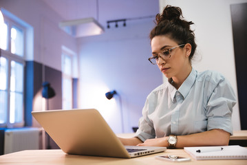 Smiling professional woman in glasses working on a computer at her desk, symbolizing productivity, modern business, and efficient remote work.