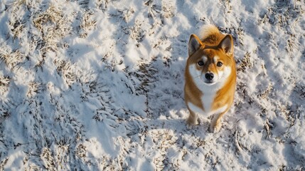 Shiba Inu dog in snowy field, looking up.  Possible use Stock photo for pet adoption campaigns or winter pet themes